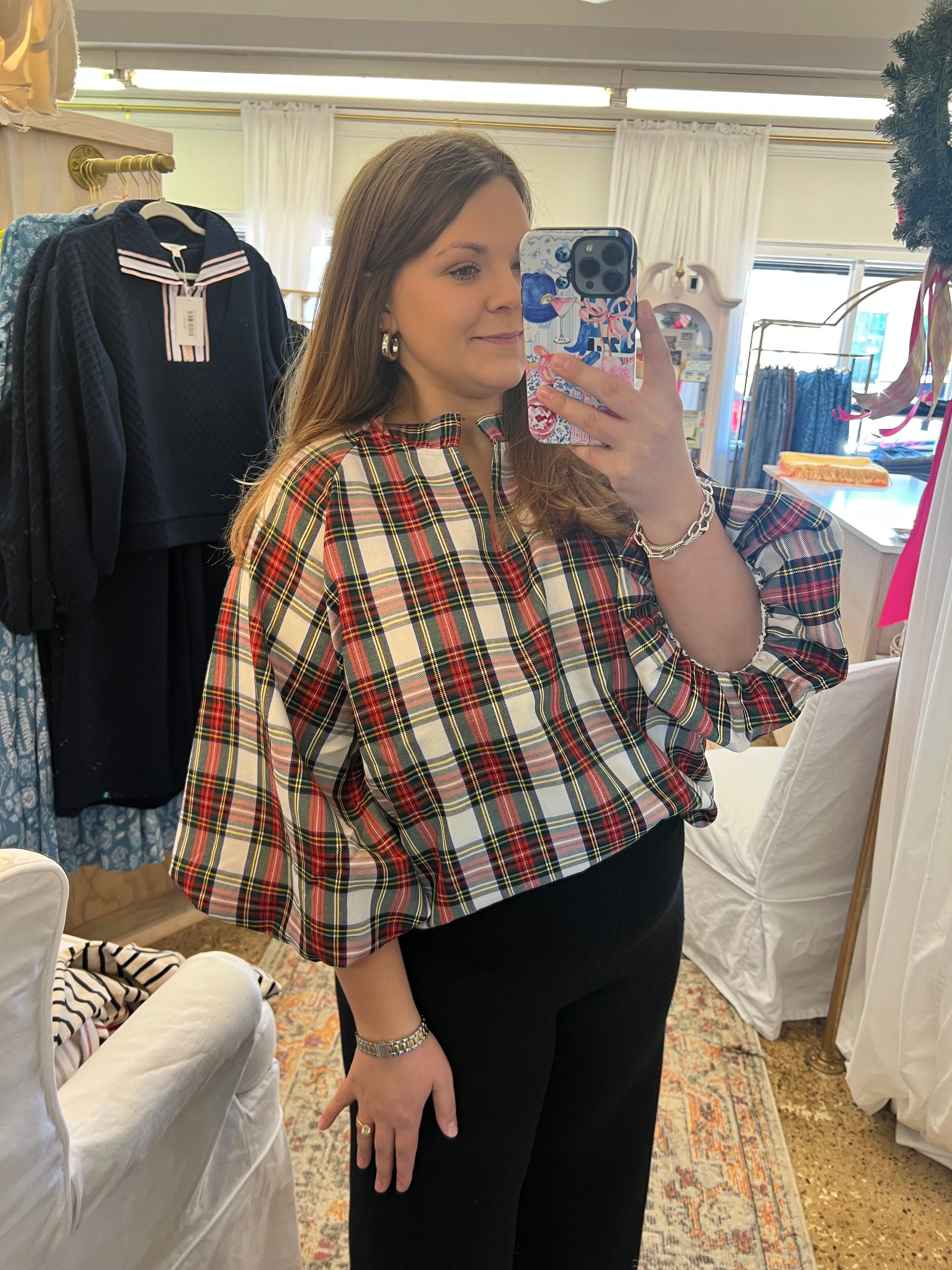 This is the most classy plaid blouse you’ve ever seen! The elbow length and v slit neck line is so flattering. The length is long enough to wear as a tunic with some leggings and boots!