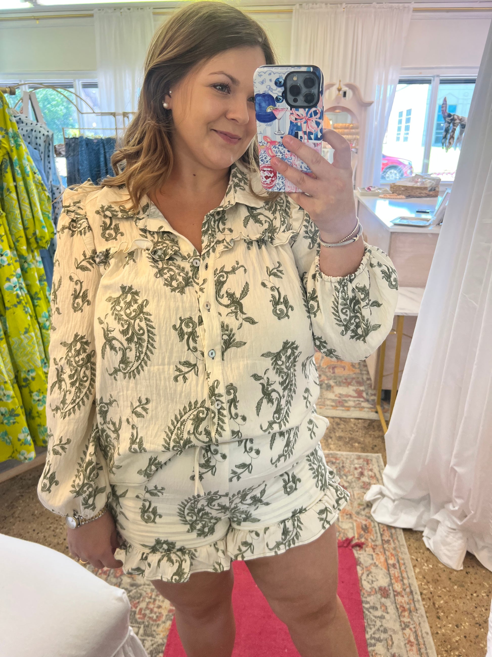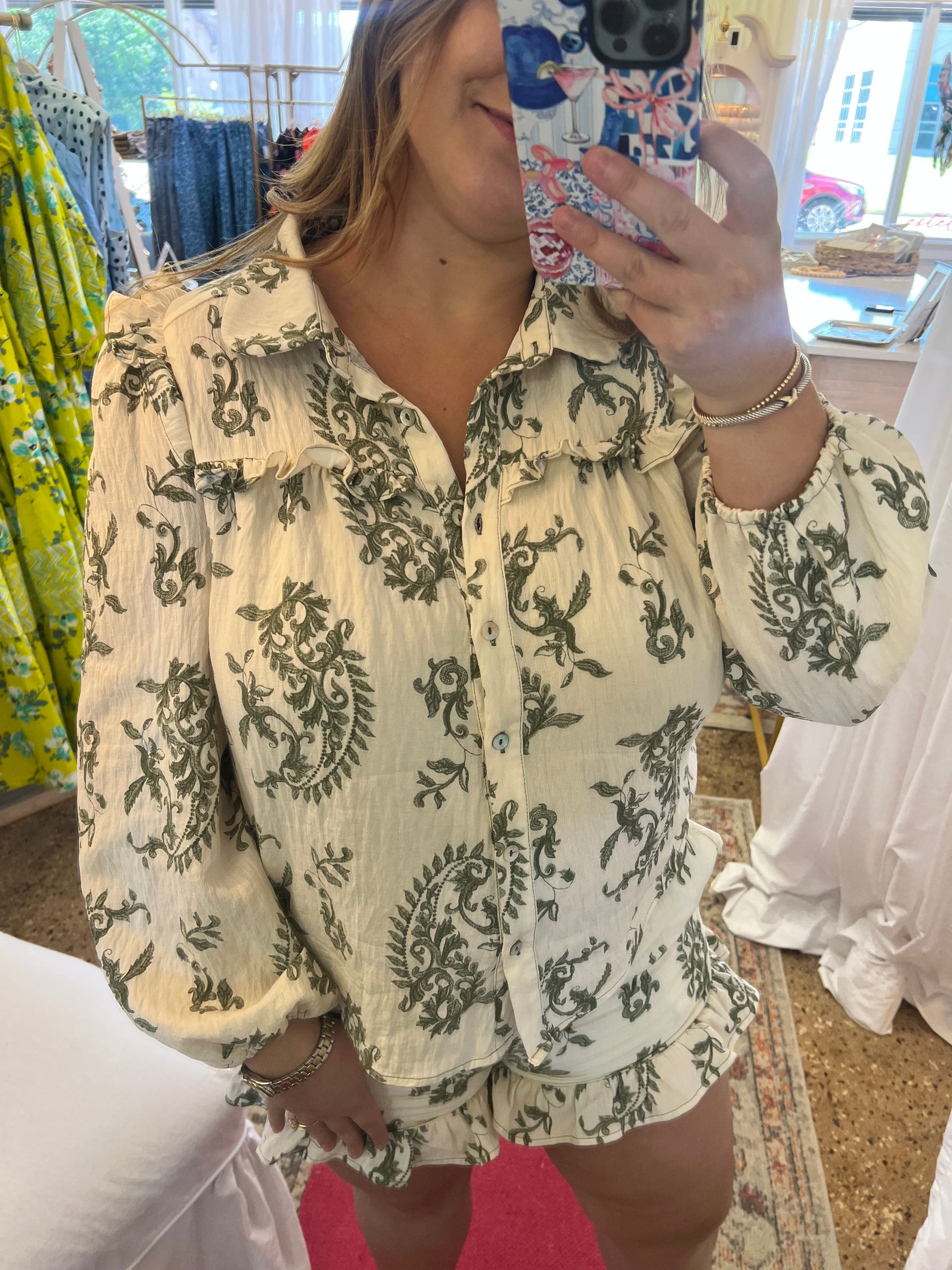 The perfect fall set! This outfit is a beautiful pearl ivory color with olive green designs. The ruffles are so cute and girly. Pair with sneakers for a casual outfit. Also looks soooo cute with boots for a date night or dressier outfit!